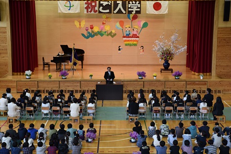 | 平成30年4月5日 本日、56名の1年生が元気に入学しました。大勢のご来賓の方々にご臨席いただき、平成30年度東小学校の入学式が行われました。 |