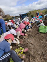 学校の畑で育てていたサツマイモが猛暑のため枯れてしまったところ、縄文の里資料館でサツマイモ掘りを体験させていただきました。低学年の友だちみんなで協力して、たくさん収穫できました。資料館の館長さん、ありがとうございました。