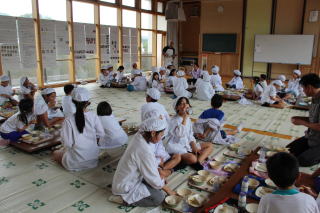 給食委員会が企画してくれた姉妹学級交流給食会が行われました。2年生と5年生は多目的室でみんな一緒に「いただきます!」おしゃべりをしながら楽しい時間を過ごしました。食べ終わった2年生が側転をしてくれたり、けん玉を披露してくれたり、運動会のダンスを踊ってくれたりしました。姉妹学級同士、なかよくしていきましょう。