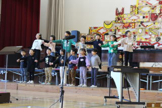 今年の音楽鑑賞教室は「アカペラ」に挑戦!!アカペラという言葉は、イタリアの言葉で、””教会風に”という意味があるそうです。全校の友だちが3つのパートに分かれて歌った「どんぐりころころ」素敵な歌声が体育館中に響きました。