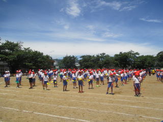 | 令和3年6月5日(土) 前日は大雨でしたが、本校の校庭は水はけがよいので、無事運動会を行うことができました。 本年度もコロナ禍のために、来賓等もお呼びできなかったのですが、子どもたちはマスクをつけながら(演技中は外す)も、保護者や友だちの応援を得て精一杯の運動会を行うことができました |